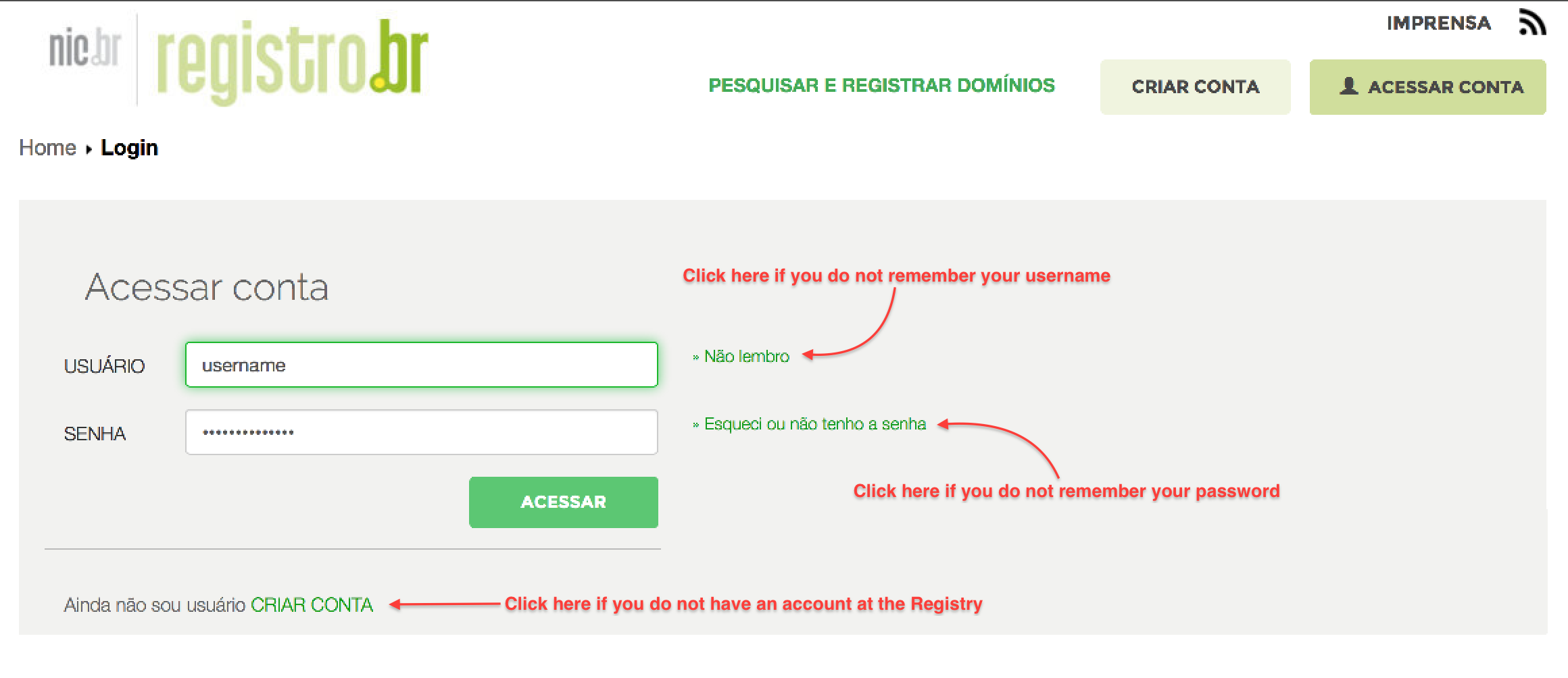 Log in to the .BR Registry panel at https://registro.br/cgi-bin/nicbr/login.